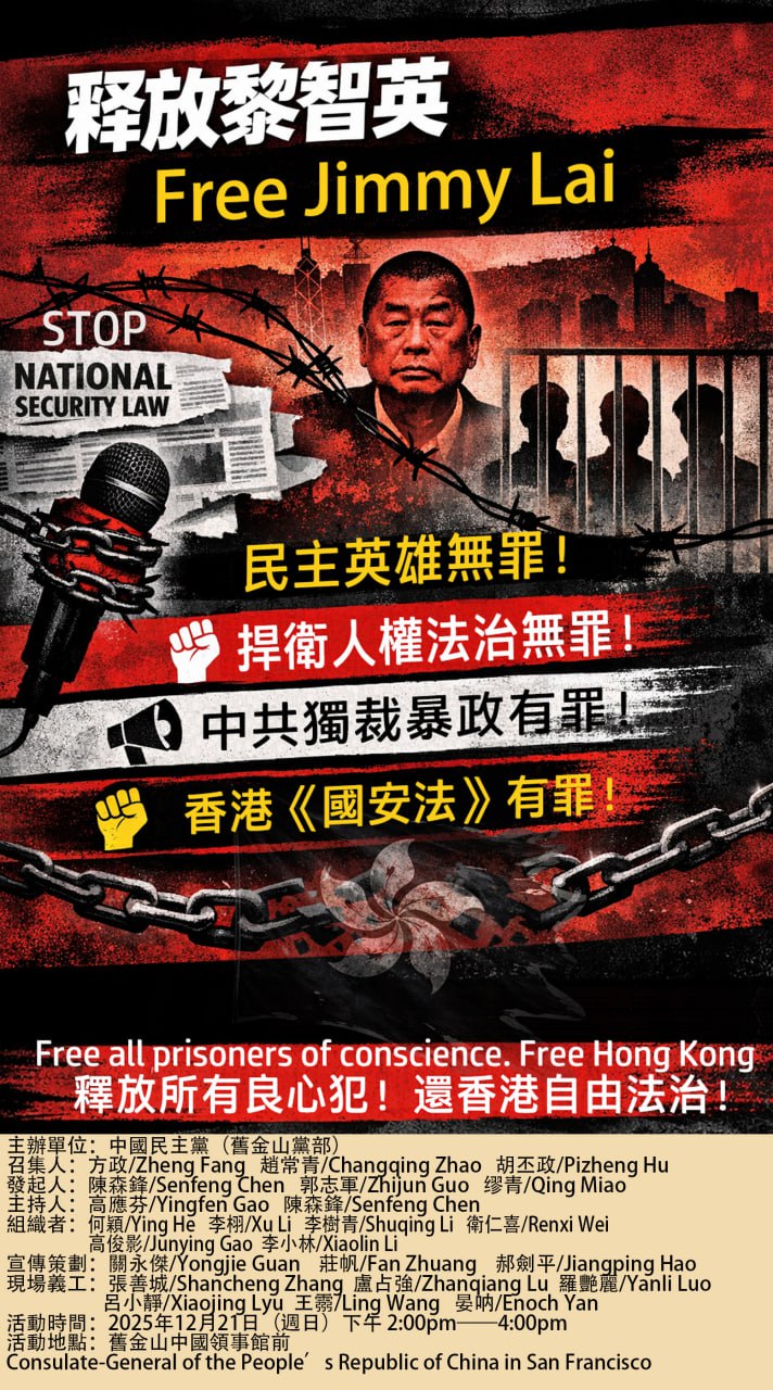 活動主題:要求中共立即釋放黎智英!民主英雄無罪!獨裁暴政有罪!