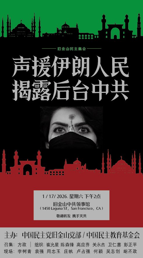 在伊朗哈梅内伊政府對民眾實施血腥鎮壓的悲惨时刻,中国民主党旧金山党部号召大家,一起声援勇敢的伊朗人民,一起为子孙后代的平等自由,付出我们的努力!