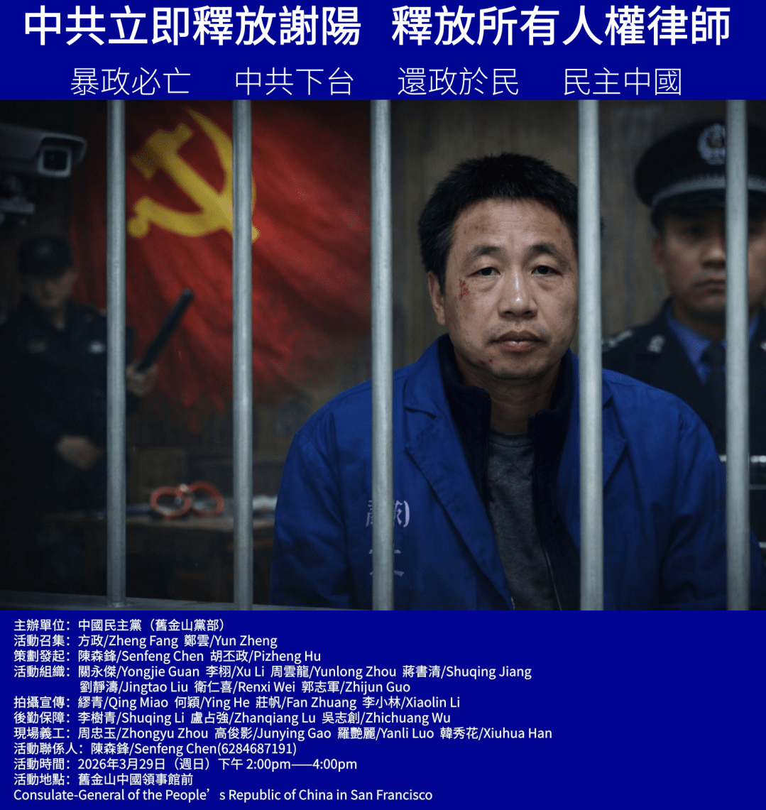 中共立即釋放謝陽!釋放所有人權律師!